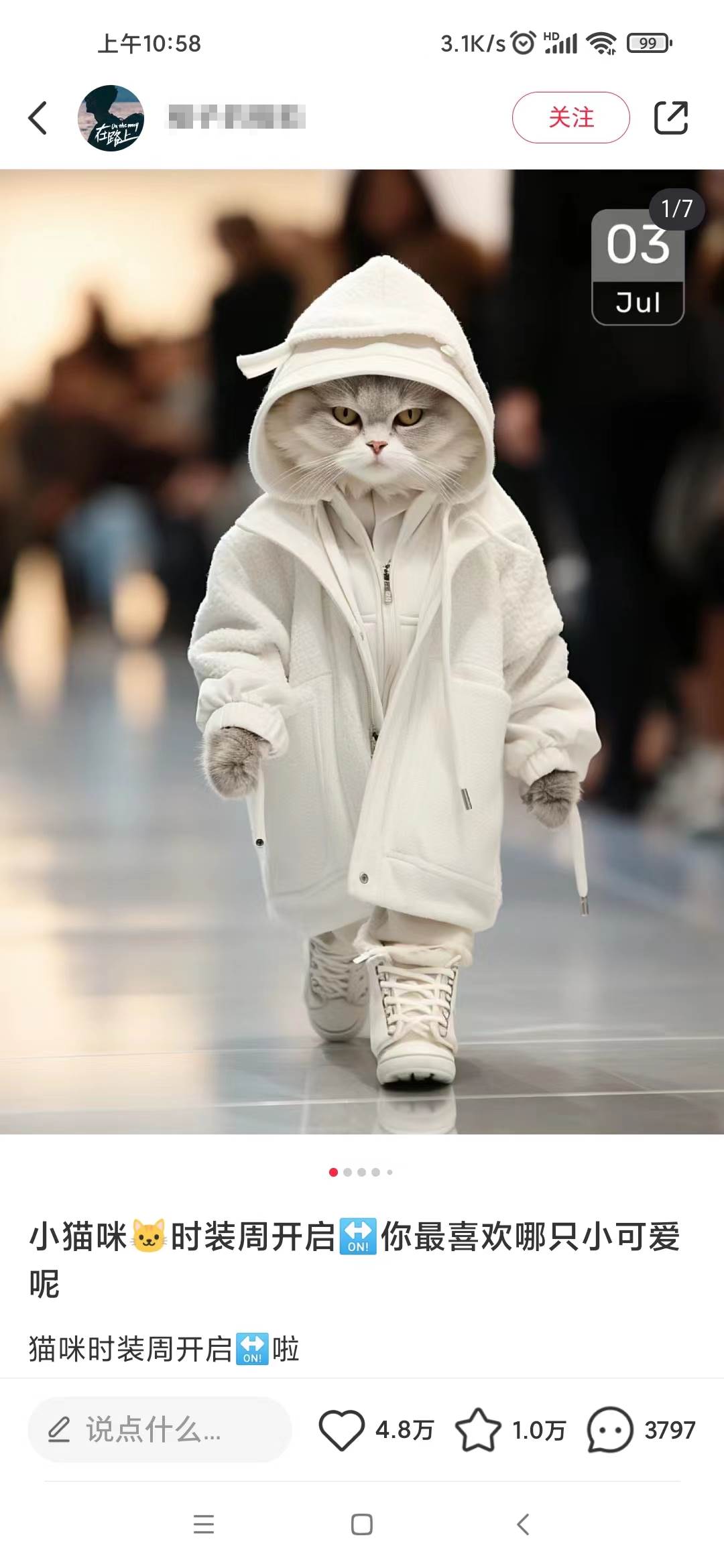 Animal秀在小红书上是非常爆款的项目,动不动就几万的赞,笔记的内容主要是猫咪走秀搭配一段文案,就是一只猫穿着人类的衣服在走T台,看起来非常的新奇特,加上小红书的主要用户群体是女性用户,女大学生,少女,宝妈这类,而大部分女性都是比较喜欢猫咪这类动物,加上我们的猫咪图片非常的可爱或者酷帅,很难不爱。