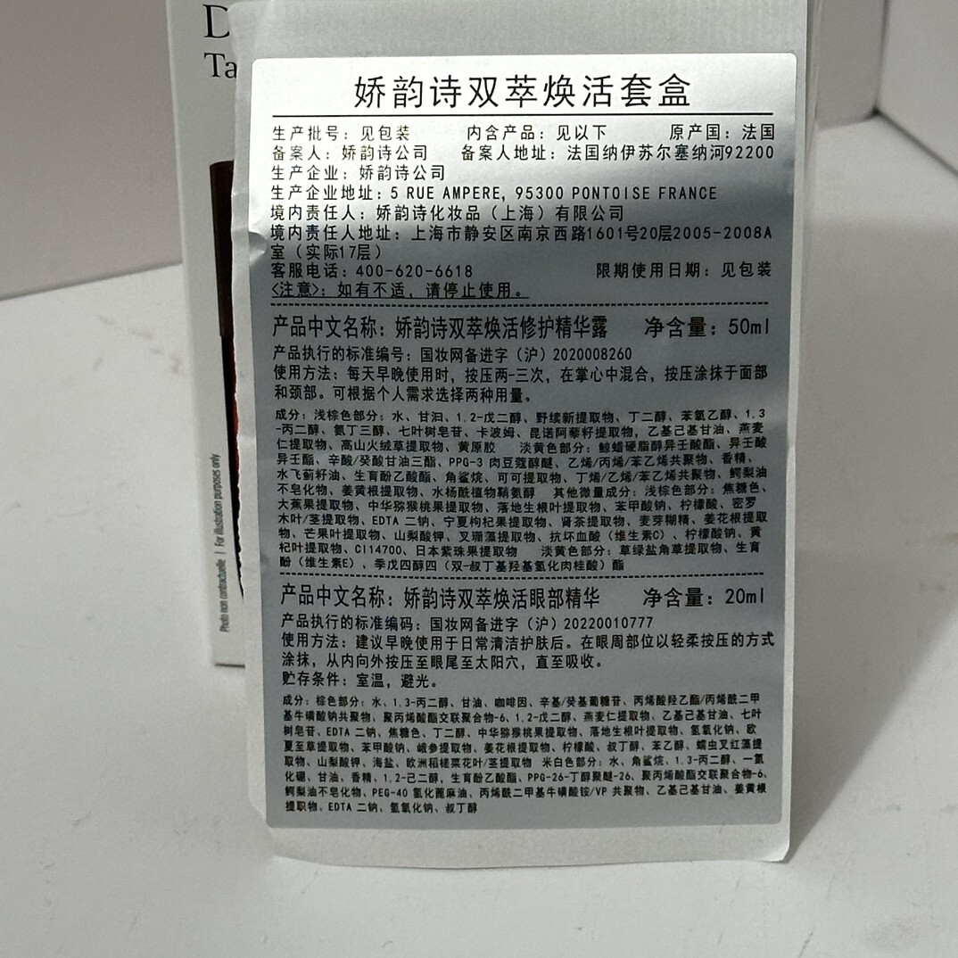 实拍高质量新版娇韵诗双萃两件套 带中文标件44 认准批号:043038A内含:双萃精华50ml+双萃眼霜20ml