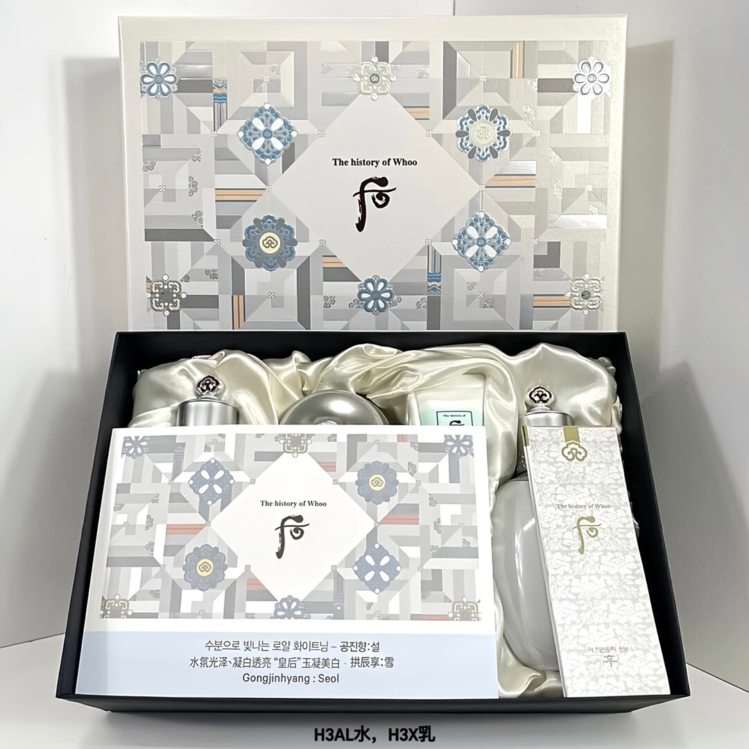 Whoo后雪美白六件套24款配中文标最新版后雪美白六件套推荐给有斑、肤色不均匀的!舍不得买一千多一瓶的小灯泡,你可以买一套Whoo后美白三件套、能淡斑、防止斑、还可以晒后修复、美白~想除暗黄,各种杂斑的妹子的福音来了这款后雪套盒,美白淡斑,让您的肤色更加亮白,提亮肤色!