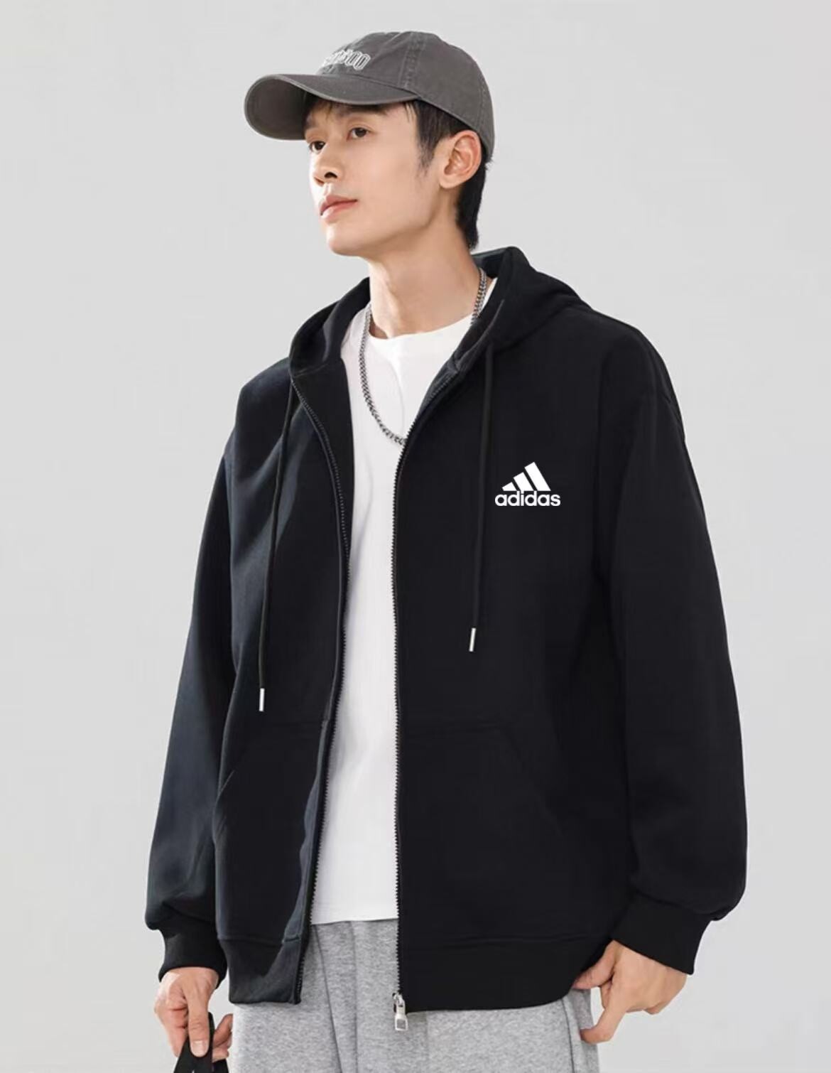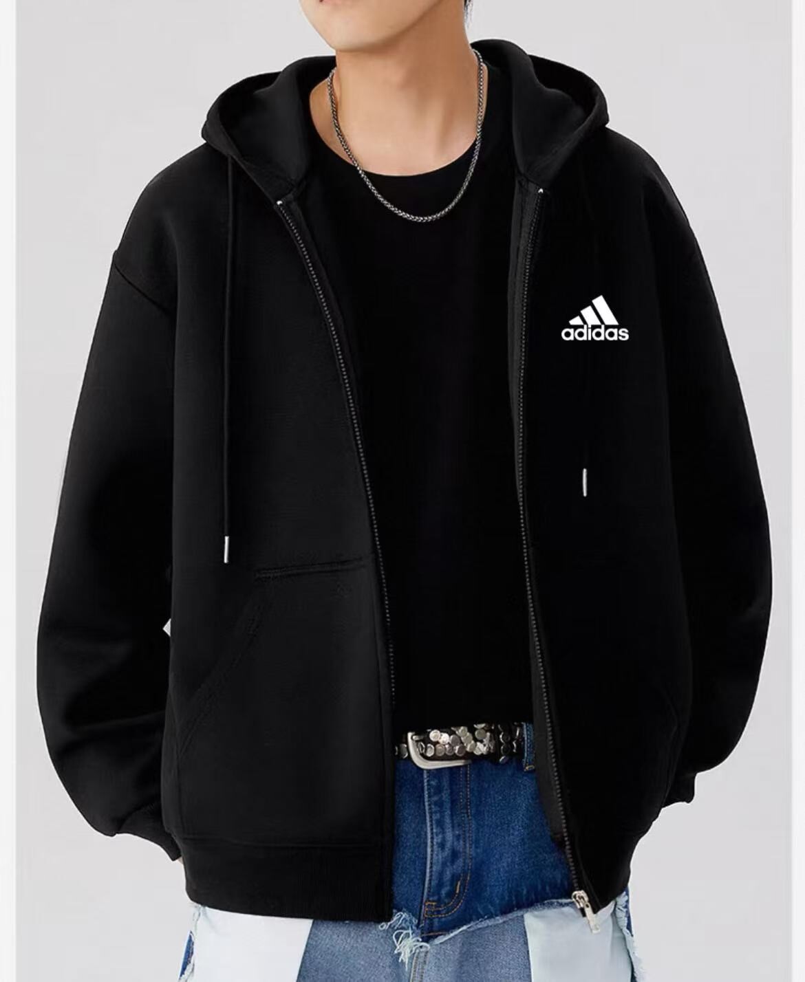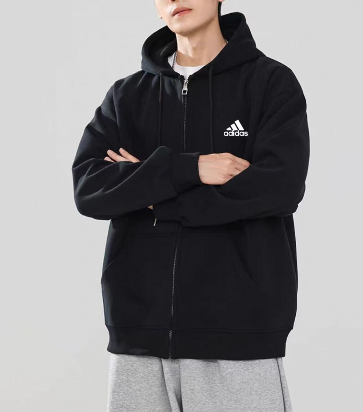 阿迪达斯Adidas三杠百搭落肩宽卫衣连帽华棉开衫外套】春秋百搭必备时尚单品 ,不起球不掉色,灰色干净有气质 不挑人穿 关键是随便搭配都好看!秋天在里面搭一件白色T恤打底衫 简约又休闲整件用的重磅棉 拿在手里很有分量感 上身满满的高级感颜色:黑色 灰色