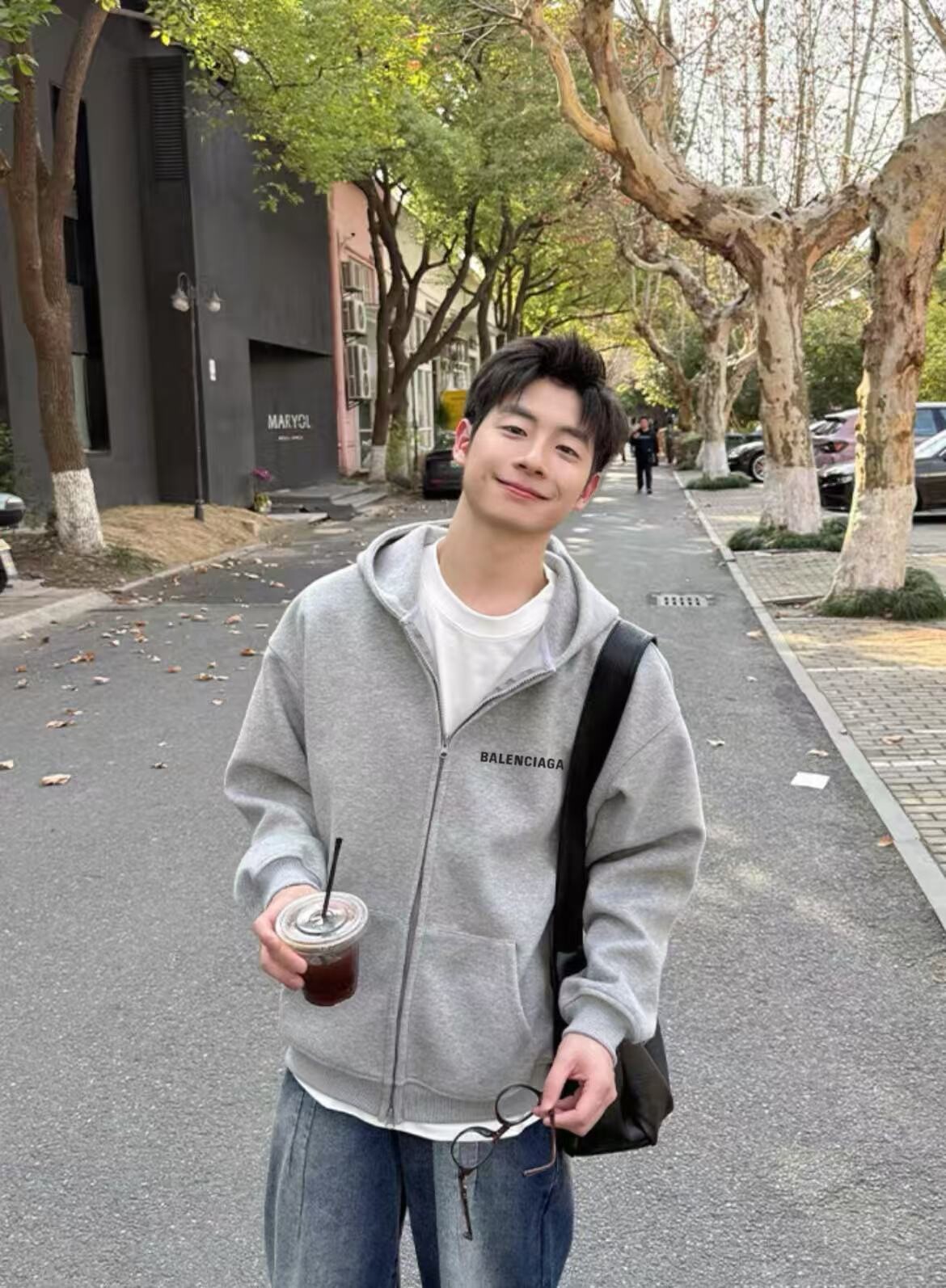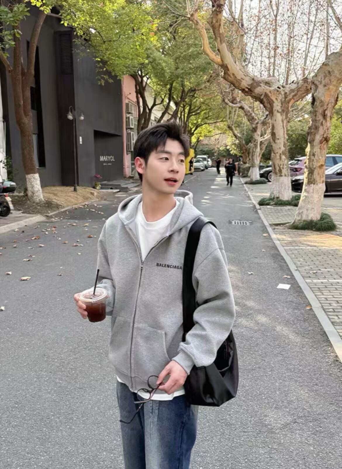 巴黎世家 BALENCIAGA百搭落肩宽卫衣连帽华棉开衫外套】春秋百搭必备时尚单品 ,不起球不掉色,灰色干净有气质 不挑人穿 关键是随便搭配都好看!秋天在里面搭一件白色T恤打底衫 简约又休闲整件用的重磅棉 拿在手里很有分量感 上身满满的高级感颜色:黑色 灰色