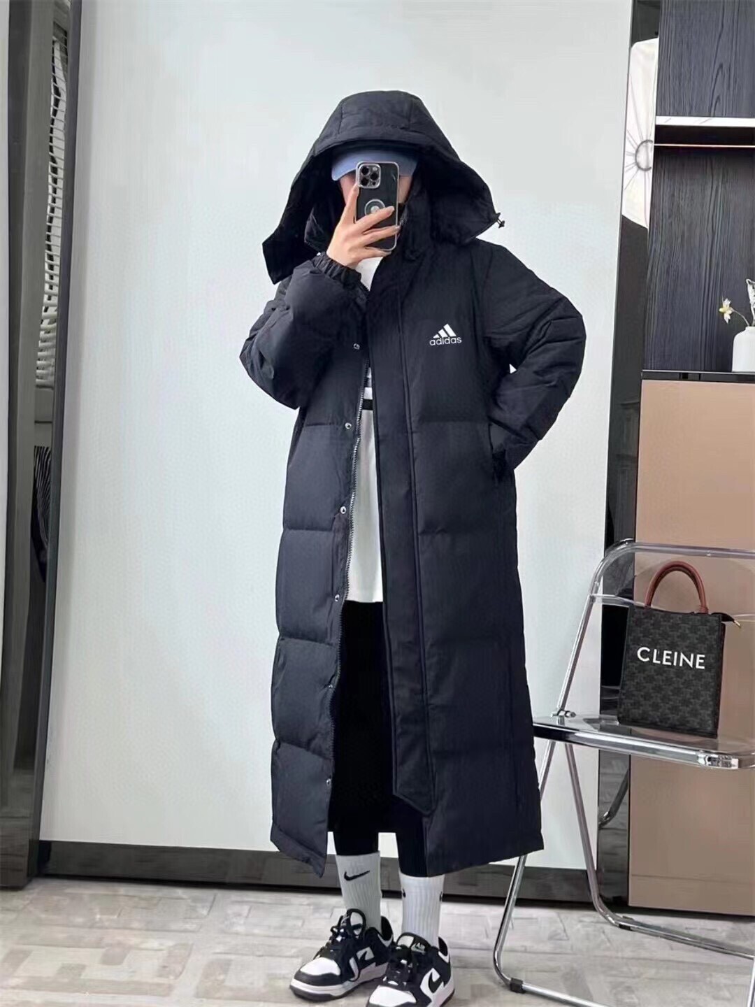 阿迪达斯Adidas印花织带男女长款连帽羽绒服原单渠道货源,真正来之不易的好东西!经典三条杠织带设计款式,随随便便穿个好几年都不会过时!